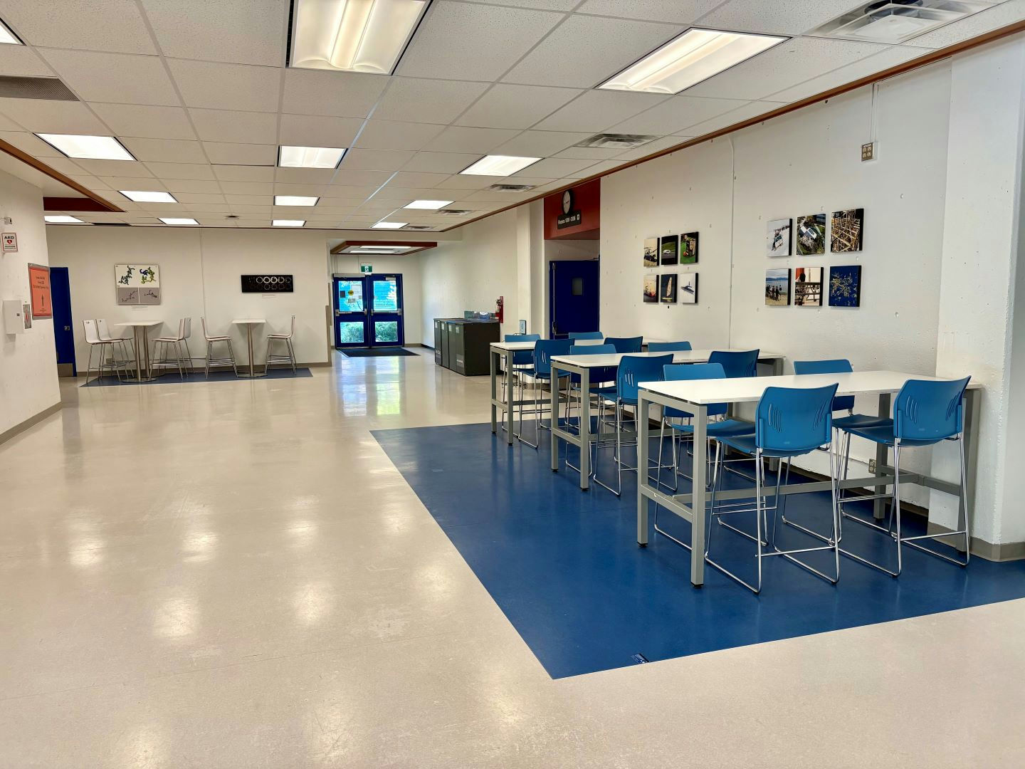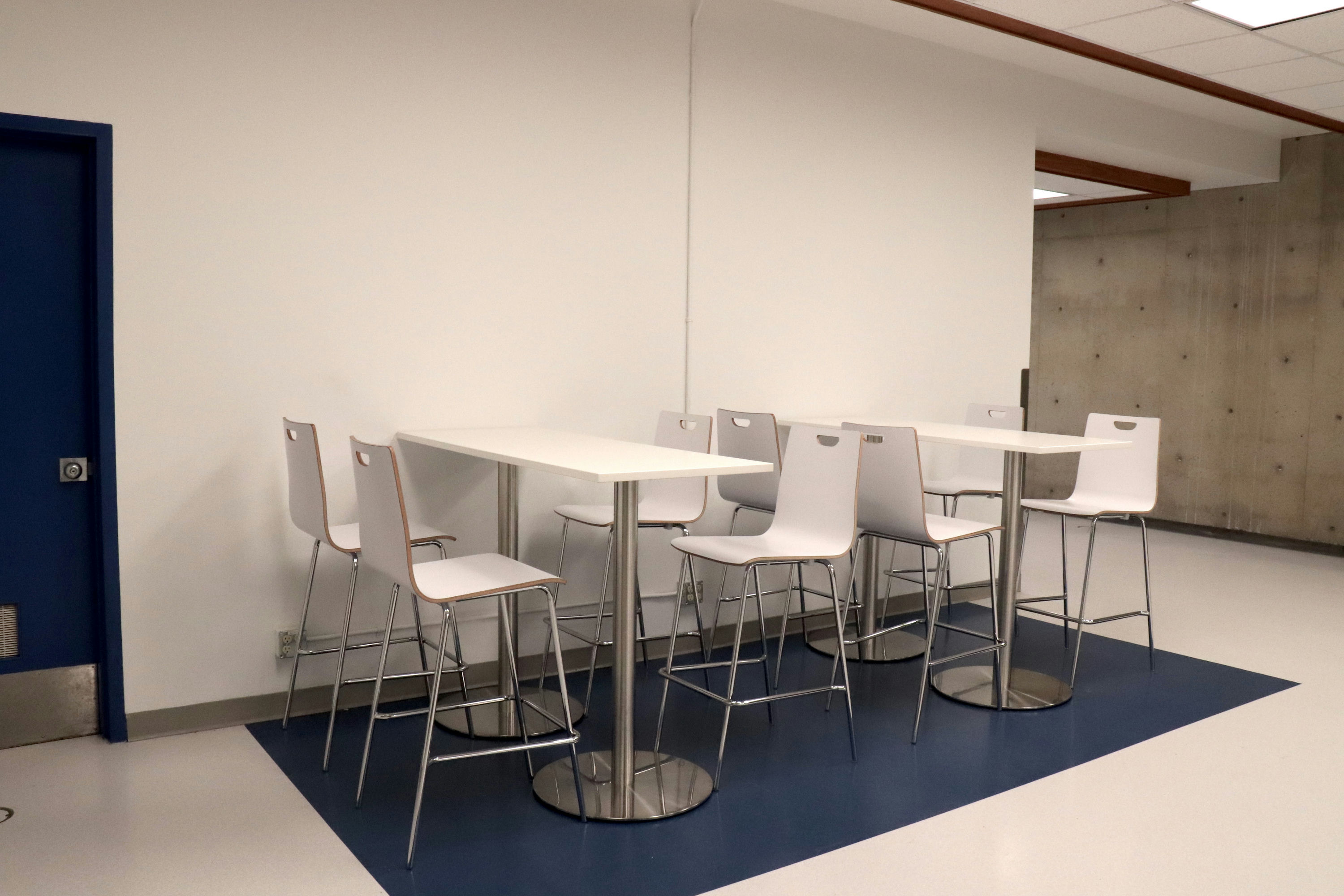 Informal learning spaces perfect for individual or group work. Study at the high-top tables offered on the main floor of this building.