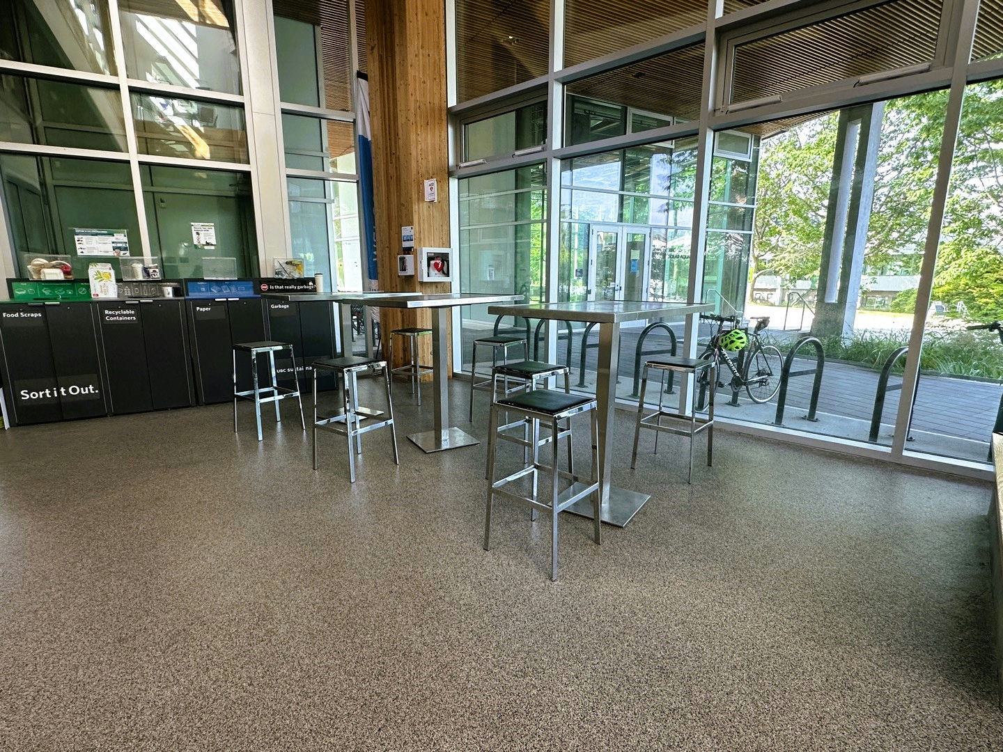 3 tables form a casual study spot on the first floor of CIRS. The concourse can be used for individual or group work. Booking information (for events): https://cirs.ubc.ca/venue-booking/