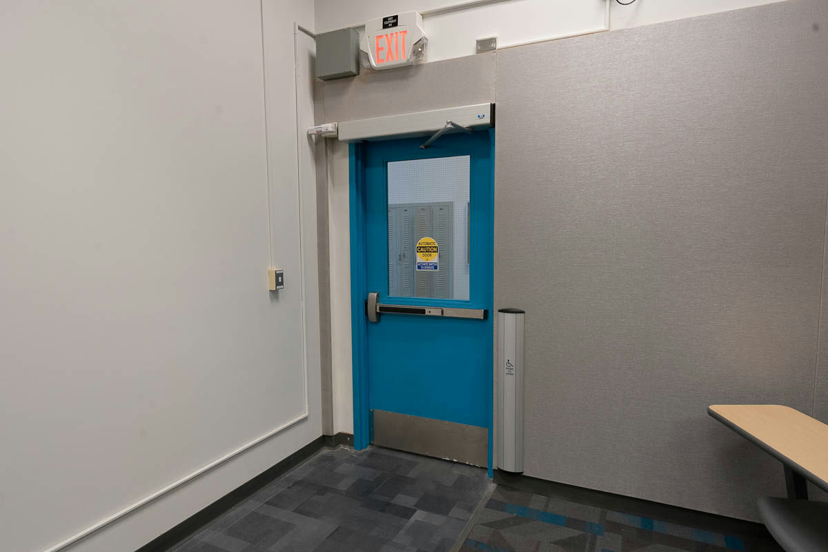 The door to the front of the room is equipped with an automatic door opener.